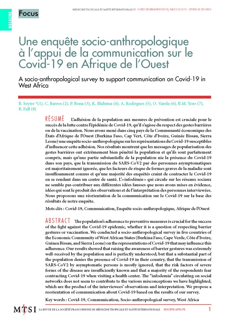 J’ai publié avec une équipe de sociologues et anthropologues dans Médecine Tropicale et Santé Internationale (MTSI) et l’American Journal of Tropical Medicine and Hygiene (AJTMH) les résultats d’une enquête que nous avons menée au Burkina Faso, en Côte d’Ivoire, en Sierra Leone, en Guinée Bissau et au Cap Vert, pour l’Organisation Ouest Africaine de la Santé. Cette étude apporte des informations inédites sur les raisons de la mauvaise adhésion aux mesures de prévention contre le Covid-19, informations cruciales au moment où les réticences d’une partie de la population a un impact important sur le respect des gestes barrières et la réussite de la vaccination.